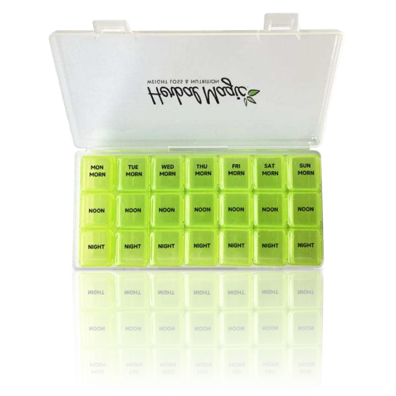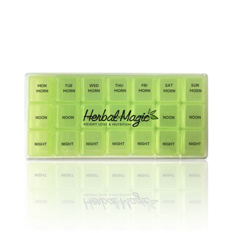 • Our Pill Organizer includes 21 easy to access compartments to help you organize your supplements for the day and week!